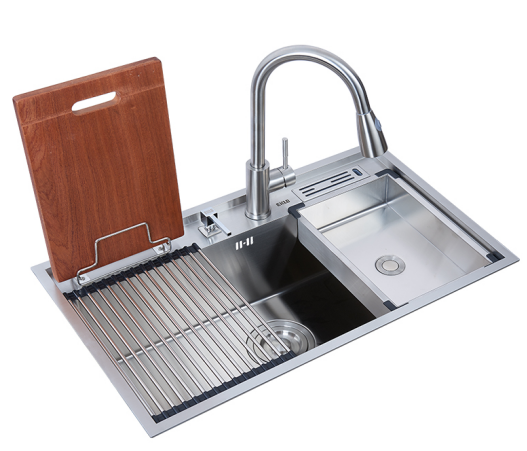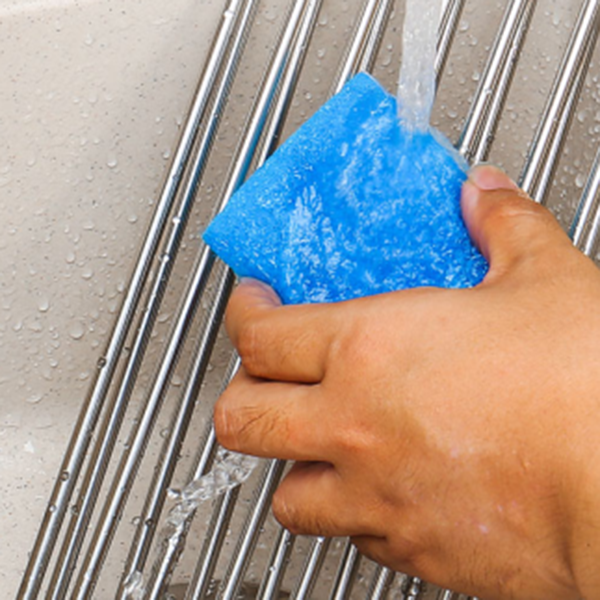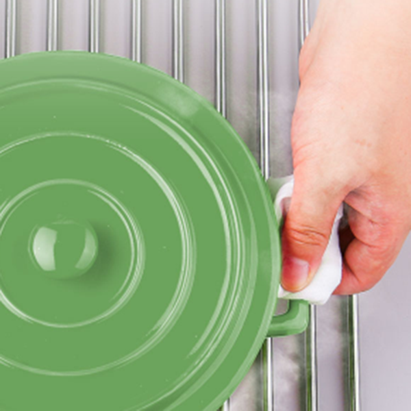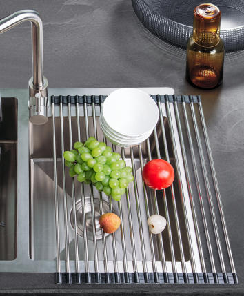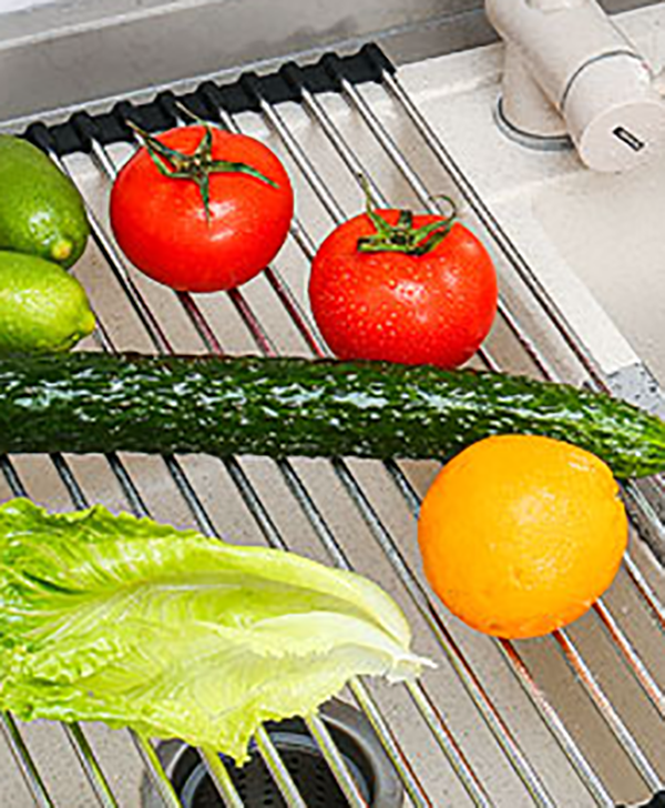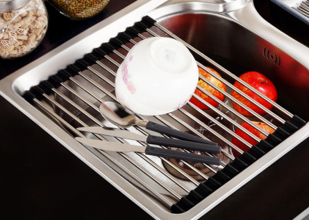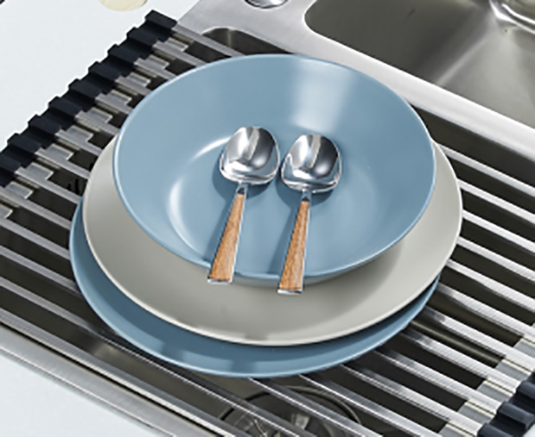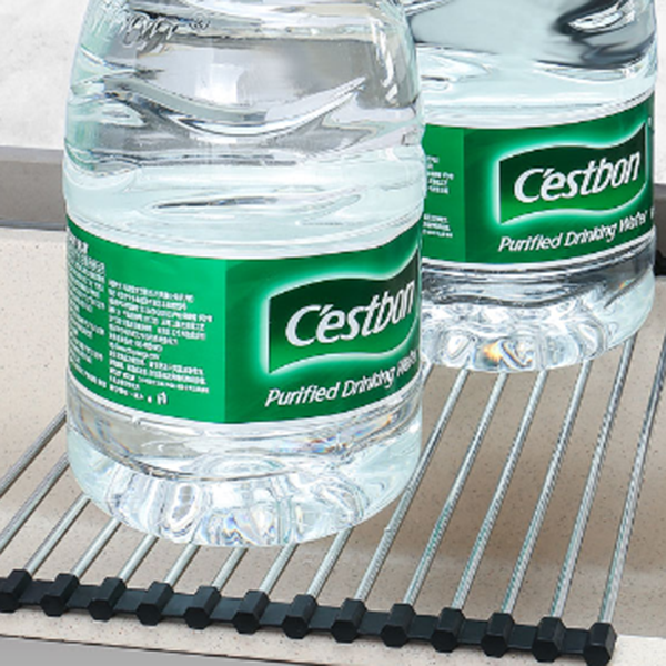 Ролковата подложка за мивка е изработена от неръждаема стомана 304, която е безопасна за използване и издръжлива.И двата края са силиконови ръкави за храна, които са по-удобни за държане и не са лесни за плъзгане.Той може да използва пълноценно пространството на котлона и може да подложи кухненските прибори и врящите неща, което играе добра роля за защита на плота.Дренажната подложка е подходяща за повечето мивки.